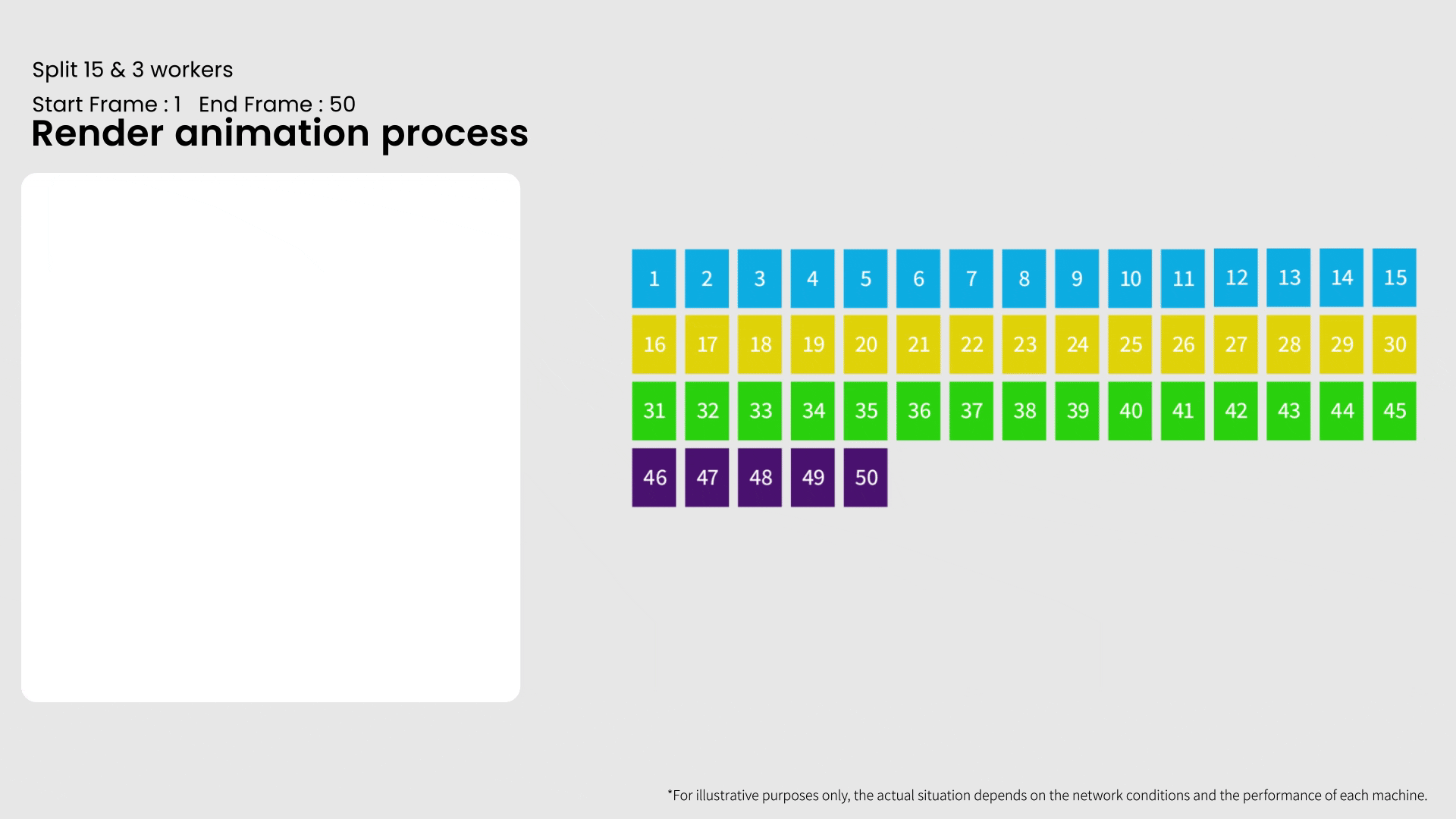 RenderWorkshop divides animation sequences into segments, assigning each as a task to different worker computers for rendering. Once a worker completes a segment, it's saved to shared storage. Workers that finish first are automatically assigned the next task.