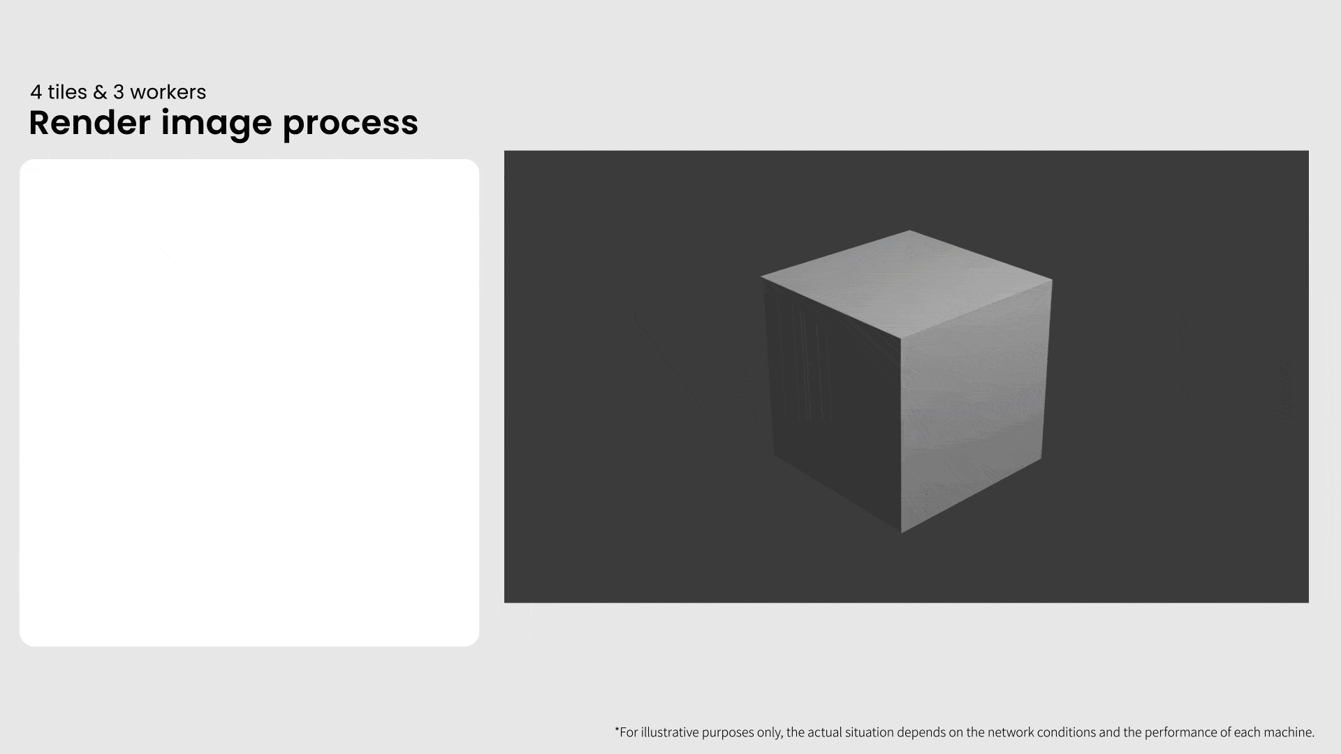RenderWorkshop splits images into several tiles, with each tile acting as a task. These tasks are sent to various worker computers for rendering. Once a worker finishes rendering a tile, it saves the result to a temporary folder in shared storage. Workers that complete their tasks early are automatically assigned new ones. After all tiles are rendered, the manager combines them into a single, complete image.